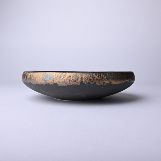 その性質を持つ金地と、荒い質感の黒の組み合わせにより、力強い印象と和洋折衷合わせやすい柔軟性を持ち合わせる「中皿ーくくり手鉢ー」。